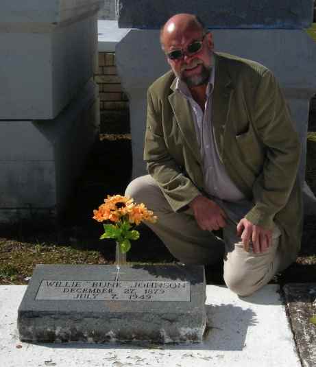 besöker George Lewis.Förra gången jag var i New Orleans besökte jag bland annat George Lewis grav och det gjorde jag faktiskt nu också. Vi var också och tittade på Bunk Johnsons grav i New Iberia. Intressant också för mig som begravningsentreprenör, haha! Första helgen hyrde Brian och jag en bil och åkte upp längs Mississippi och besökte även där en grav efter en gammal legendar, nämligen bluesmannen Robert Johnson. På vägen dit så hamnade vi också i en radiostation där vi blev intervjuade och fick spela klarinett och banjo i direktsändning. Så småningom hamnade vi i Memphis där vi hälsade på Elvis, men han var tyvärr inte hemma. Vi var även nere i Louisiana och lyssnade på bra musik i Mammou, dragspel, fiol, gitarr och bas. Fullt ös. ![]() Bunk Johnson får blommor. Fick du nåt gott New Orleans-käk? Det finns verkligen alla sorter i New Orleans. Jag och Knut var ute en dag och käkade hummer, och det var inte vilken hummer som helst, det lovar jag. Ja, och sen var det Gumbo, Jambalaja och Red beens and rise. Och en massa skräpmat också. Åk dit! |
