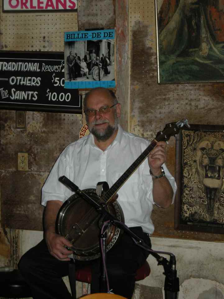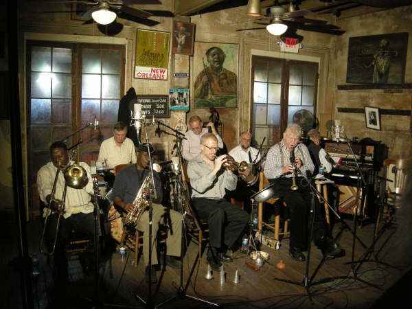 allra heligaste - Preservation Hall. Varför åkte du till New Orleans? Jag var i New Orleans första gången 2004 året före orkanen Katrina. Året efter skulle jag också åkt tillsammans med Brian Carrick, planet skulle gå dagen efter att Katrina hade dragit fram, så som du förstår blev den resan inställd i sista minuten. Så när Brian i våras frågade mig om jag ville följa med till hösten och vara med i det band han skulle sätta samman där, så var det ju ingen tvekan. Vi åkte den 1 november och kom hem den 18. Hur hamnade du i Preservation Hall? Brians band hade jobb på flera ställen i New Orleans och den här kvällen spelade vi på Fritzels Jazz Pub på Bourbon Street. När det var slut där så gick vi till the Hall för att lyssna. I pausen kom författaren och klarinettisten Tommy Sancton fram och hälsade på oss, han var ledare för bandet den kvällen, och frågade om vi hade instrumenten med oss och det hade vi ju. Så Brian och jag satt in och spelade nästa set med dem. I bandet den kvällen var vi faktiskt två svenskar eftersom Lars Edegran spelade piano. De andra kommer jag faktiskt inte ihåg namnen på, basisten var i alla fall 83-årig liten svart man med röda solglasögon och vit keps. Cool typ. Hur kändes det att spela på denna heliga plats? Det var häftigt. Det är ju inte så många svenska musiker som spelat där. Å andra sidan är det rätt mycket häftigt som händer när man är i New Orleans. Men lite talande är det ju att jag inte alls kommer ihåg vilka låtar vi spelade. Bara att det var typiskt Kid Thomas-stuk och att jag kunde harmisarna i alla fall. Brian och Tommy hade förstås en del fina duetter på sina klarinetter. Så gjorde ni skivinspelning också? Ja, två stycken till och med. En på Preservation Hall och den andra på Maple Leaf Club. Den senare var en sån där dancehall-spelning, som på den gamla tiden, och den videofilmades dessutom. Vad var det för gubbar i bandet? Det var lite olika på dom båda inspelningarna. Jag kommer inte ihåg namnet på alla, men det var i alla fall Brian på klarinett och tenorsax och jag själv på banjo. Patrick Tevlin från Happy Pals i Toronto, spelade trumpet, Darryl Adams, som spelar i Preservation Hall Jazz Band, på altsax, Robert nånting spelade trombon, liksom Darryl var han från New Orleans. Och så var det Andrew Hall på trummor, Bernie Attridge på bas, och inte minst Knut Lauridsen från danska Limeriver Jazz Band på piano. Vi får väl läsa på omslagen när skivorna kommer så småningom. Begravningsentreprenören